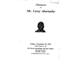 This is the funeral program of Leroy Abernathy who was born on April 4, 1937 and died on November 23, 1991. The funeral was held on Friday, November 29, 1991 at 11:00 A.M at the Mount Calvary Seventh-day Adventist Church.