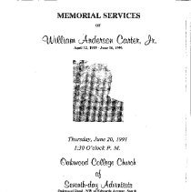 This the funeral program of William Anderson Carter, Jr who was born on April 12, 1919 and departed from this world on Sunday, June 16, 1991. The funeral took place at Oakwood College Church of Seventh-day Adventists on Thursday, June 20,1991 at 1:30 P.M.